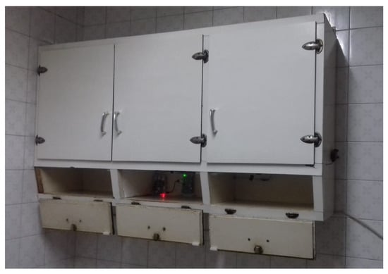 The test was conducted in a real kitchen so that participants were familiar with the scenario. The Raspberry was set up inside a kitchen cupboard as shown in Figure 8. The size of this cupboard was 130 cm width × 71 cm height × 29.5 cm depth, and it was 150 cm above the ground. In spite of having five compartments, we only used the bottom three in order to avoid having compartments of different sizes.