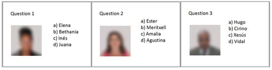 The next step for participants was to take a control test based on face–name pairs in order to statistically compare these results with the SC results and to determine whether our SC is able to measure memory. This test was similar to the common memory tests about face–name pairs in the literature [,], and we used a short-time version that did not require several days for acquisition and retrieval phases. In this way, each participant could do all the experimentation in the same day, facilitating the task of recruiting unpaid volunteer participants. In this experiment, the test of face–name pairs consisted of showing a series of 30 face–name pairs to the participant such that they memorized these associations in the acquisition phase. Each face–name pair was presented to the user for 6 s, and consequently the whole acquisition phase took 3 min. In the retrieval phase, each participant had to respond to 30 questions. Each question was composed of a face image and four name options, and the participant had to fill a form provided by the experimenter with the answers to these questions. Figure 9 shows an example of three questions. The face images have been blurred in this article to protect the privacy of the models. The retrieval phase had no time limit, but the experimenter instructed the participants to reply to the questions as accurately and quickly as possible, and the reaction time was measured.
