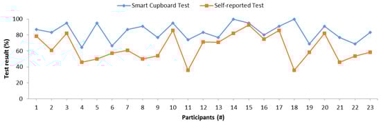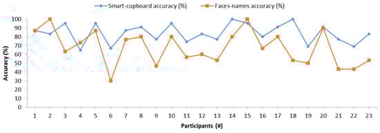 In order to double-check that the sensors system of the SC was working properly, the experimenter took notes about the fails and successes of participants during the experimentation phase, and then the notes were contrasted against the system log. The notes and SC logs and results matched perfectly. The accuracy percentage of each participant was calculated as shown in Equation (1) as a measurement of their memory: