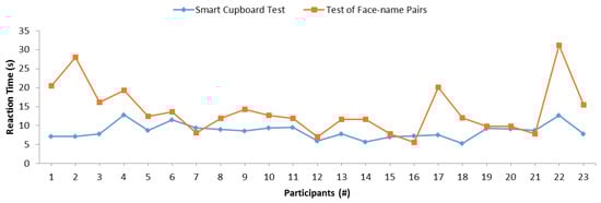 Moreover, we analyzed the reaction time of participants in the SC and face–name pairs tests. Figure 11 depicts the reaction time of each participant in both tests. The blue line represents the SC test and the orange line represents the test of face–name pairs. In order to calculate the reaction time of the SC test, the experimenter took note of the time spent by a participant to remember each item inside the SC. Then, this was compared with the time in the system log in order to check that all times were correct. Thus, 20 reaction time results were obtained for each participant. Finally, the reaction time of each participant was calculated as the mean of all obtained times. In the face–name test, the experimenter also measured the time spent by a participant in order to perform the test. The reaction time was obtained from the division of the total time by the total number of questions by each participant. According to the trend and direction of both lines in the graph, it is not easy to appreciate the similarity in general. Nonetheless, a certain similar behavior is appreciated between participant 7 and participant 15. A similar correlation can be appreciated between these two tests, since both lines are almost parallel. Because this observational analysis is not sufficient to determine whether there was any significant relation between tests in reaction times, we performed another Pearson’s correlation test to statistically determine whether there was a statistically significant correlation. Table 4 depicts the result of the correlation test. It shows that both variables were not significantly correlated. Neither Kendall’s tau coefficient nor Spearman’s rho coefficient detected any significant correlation with respective p-values of 0.597 and 0.428. Thus, in these experiments, the reaction time of our SC test did not correlate with the reaction time of the control test of face–name pairs.