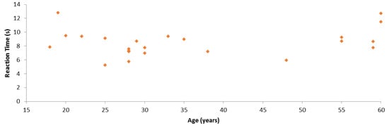 We also conducted an analysis of the relation between participant age and SC reaction times. Figure 12 represents each participant considering these two aspects. It is worth highlighting that we asked people to participate in these experiments, considering their age, to have both young and aged people. In particular, there were six young participants in the 18–25 years old range and six aged participants in the 55–60 years old range. In order to determine whether there was a statistically significant correlation, we performed three correlation tests between SC results and age. Table 5 shows the results of the Pearson’s correlation test. One can observe that these variables were not correlated according to this test. In addition, neither Kendall’s tau coefficient nor Spearman’s rho coefficient detected any significant correlation, with respective p-values of 0.265 and 0.300. Thus, SC results and age were not statistically significantly correlated in these experiments.