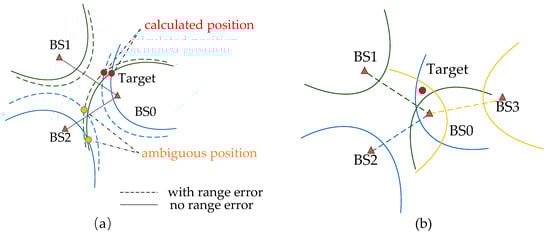 Target localization based on a group of sensor nodes whose positions are known has been extensively studied in research on signal processing [1,2,3]. It has been applied widely in military and civil fields, including sensor networks [4], wireless communication [2], radar [5], navigation, and so forth [6,7,8]. Commonly adopted positioning methods include the signal’s time of arrival (ToA) [9], time difference of arrival (TDoA), frequency difference of arrival (FDoA) [10,11,12,13], or doppler shift [14]. Compared with FDoA, the TDoA and ToA methods can achieve higher positioning accuracy and require only one channel for each sensor node to perform the measurement, which can minimize the load requirement for a single-sensor node.