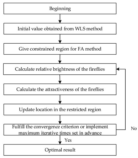 As shown in Figure 2, the WLS and FA methods are combined for optimal implementation. The initial value is obtained by the WLS method, then the initial result can be used to provide the restrained area for the FA method to search for the optimal result. There are two conditions when the algorithm ends, fulfilling the convergence criterion or implementing maximum iterative times set in advance. As for the former condition, the values of the objective function obtained in the and iteration are compared. Assuming that the objective function is , then the ending condition can be expressed as follows: