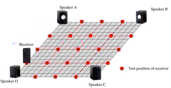 Firstly, the experiment was conducted to verify the performance of the five localization methods. There were 19 test positions of the receiver and the distribution of receiver occupied the search region as much as possible. At each test position, 50 trials were conducted under the same conditions. In total, 950 trials were carried out in this experiment. The sketch of the experiment is shown in Figure 6.