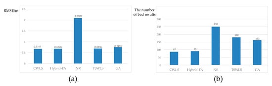 The RMSE of the five methods in this experiment and the amount of bad results are shown in Figure 7. The RMSE of the hybrid-FA method was 0.6778 m, which was lower than that of NR, TSWLS, and GA and 0.0031 m higher than that of CWLS. As for the amount of bad results, for the hybrid-FA method, it was 90, which was less than that of the NR, TSWLS, and GA methods and 3 more than that of CWLS. It can be concluded that the performance of the hybrid-FA method was superior to that of the NR, TSWLS, and GA methods for TDoA measurement.