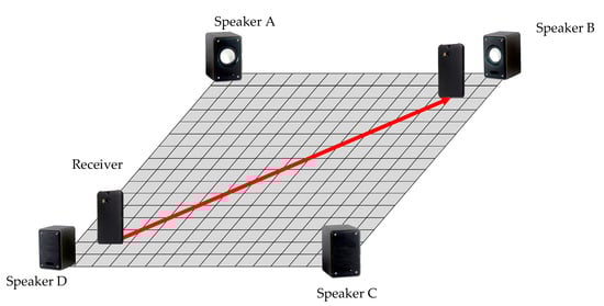 Experiments were carried out to verify the rationality of the algorithms [23,32]. The coordinates of four speakers were BS1(0,0)m, BS2(0,10)m, BS3(10,10)m, and BS4(10,0)m, which were used to generate signals. The speakers emitted chirp signals, which were continuous impulse signals of 2.5 kHz. A phone was placed at the same height to receive the sound signal as well as record the receiving time. In this experiment, time-division multiplexing was adopted. The emitting cycle was 1 s, and the speakers emitted 100 ms long signals one after another. The speaker of BS1 emitted 100 ms long signals at the beginning of every emitting cycle. The speakers of BS2, BS3, and BS4 emitted 100 ms long signals at the 250th, 500th, and 750th ms, respectively. Take the speaker of BS1 as a reference speaker. The receiving time data were saved to a text file and exported to the computer to be processed in Matlab 2014a.