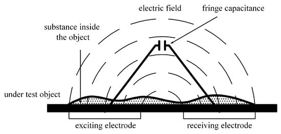 A typical capacitive sensor is made of two traces: The exciting electrode and the receiving electrode. The working principle of the coplanar capacitive sensor is called the fringe effect of capacitance [24]. The electric field is formed between the two traces with an AC (Alternating current) excitation. When an unknown substance is placed inside the sensing area, the electric field and the permittivity between the two electrodes will change according to the material characteristics of the substance. By measuring the capacitance of the sensor, the existence and properties of the substance can be identified [25,26]. A diagram of the working principle is shown in Figure 2.