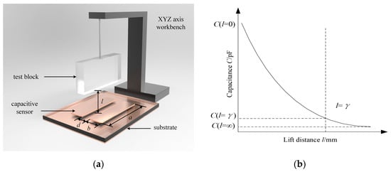 where l = 0 indicates that the test block is in full contact with the upper surface of the capacitive sensor. Furthermore, l = ∞ indicates that the test block is far from the upper surface of the capacitive sensor. In this situation, the change in l does not affect the capacitance between the electrodes. The trend of the capacitance with different lift distances is shown in Figure 3b.