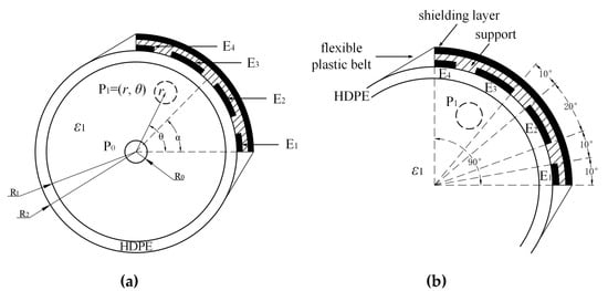 The cross-section of the sensor and pre-stressed duct is shown in Figure 4a, and the capacitive sensor structure consisted of four electrodes, named E1, E2, E3, and E4. Electrodes E1 to E4 were placed against on the external surface of the duct. The widths of electrodes E1, E2, E3, and E4 corresponded to the different central angles of 10°, 20°, 20°, and 10°, as shown in Figure 4b. The intervals between the proximity electrodes all corresponded to 10°. One quarter of the circumference was covered by the sensor. Therefore, the center of the sensor was at 45°. With the support of a flexible plastic belt, the traces could be easily fixed on the tube and rotated around the pipe. The shielding layer was placed on the outermost layer to resist the outside interference.