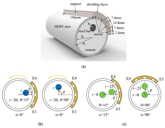 The simulations were performed using COMSOL Multiphysics, and the relevant parameters of the simulation were set as follows. Three-dimensional (3D) models were used for all the simulations. The dimensions, materials, and the relative permittivity values of the pre-stressed ducts, steel strand, and sensor in the experiment were the same as those in the simulations. The internal radius, R1, and external radius, R2, of the duct were 37.5 and 42.5 mm, respectively. A single steel bar was placed in the duct, which was filled with cement (εcement = 4). The radius, R0, of the steel bar was 7.5 mm. The widths of the electrodes were 7.4 mm for E1 and E4 and 14.8 mm for E2 and E3. The lengths and intervals of the electrodes were 150 and 7.4 mm, respectively, for all traces. The ducts and the support for the sensor were made of HDPE, and the entire capacitive sensor and shielding layer were made of copper foil. A schematic diagram of the simulations and experiments is shown in Figure 5a. The cement for grouting was standard Portland cement, and the water:cement ratio was 1:0.65 [28].