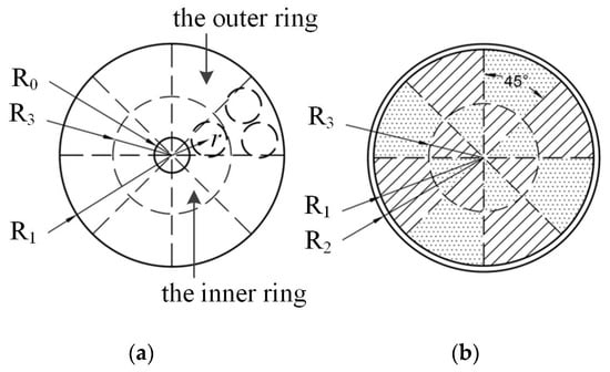 Since the diameter of the steel bar was 15 mm in this study, and the inner radius of the duct was 37.5 mm, we divided the entire cross-sectional area into 16 segments with 45° for each section, as shown in Figure 6. Such segmentation is sufficient for engineering applications. Note that the internal circle’s radius, R3, was set to 22.5 mm (corresponding to the steel bar at r = 15 mm). Thus, we only needed to identify in which area the steel strand is located instead of determining its position accurately.