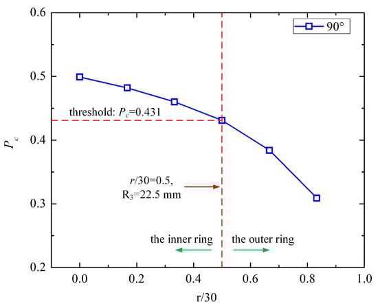 (ii) When the relative position between the sensor and steel bar was fixed, it was symmetrical for every θ in the one-phase model. Thus, the two sets of simulations shared the same trend. Therefore, we set Pc = C123/(C123 + C223) = 0.431 as the threshold of r = 15 mm (r/30 = 0.5, R3 = 22.5 mm).