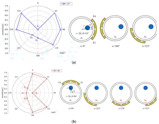 The normalized simulated capacitance between E1 and E4 and the special positions for θ detection. (a) θ = 15°, r = 20 mm, α = 0°, 180°, 225°; (b) θ = 90°, r = 20 mm, α = 90°, 225°, 270°, 315°.