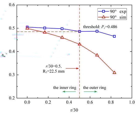 (iii) For Figure 12, the normalized Pc of the experiments and simulations shared the same decreasing tendency. There were gaps between the three measured values and the simulation, that is r/30 = 0.333, 0.5, and 0.667. On the one hand, due to the small variation of Pc in the measurements, the normalization amplified the variable quantity. On the other hand, the position error of the steel bar caused by the twisting of the steel strand and the setting of the cement contributed to the differences between the experiments and simulations.