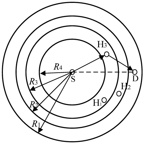 For the data packet transmission, if the direct transmission rate (denoted by rSD) is r1 or r2, the cooperative transmission will be triggered, and a helper with the maximum cooperation rate will be selected to forward the data packet for the sender (as H3 in Figure 2). Otherwise, S will send its data packet to D directly.