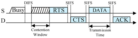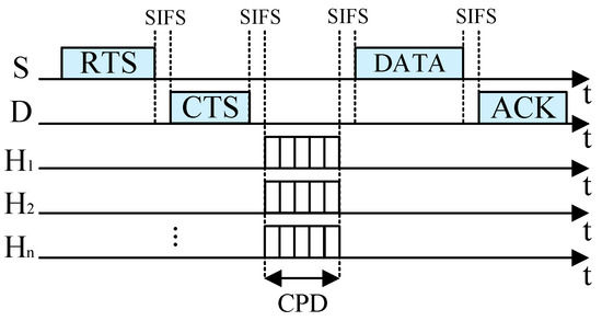 Once a sender S needs to transmit its data packet to its recipient D, it uses the distributed coordination function (DCF) to access the channel. The sender S that accesses the channel successfully sends its RTS packet to its recipient D and D replies with a CTS packet if it receives the RTS packet correctly. Through the RTS/CTS handshake, both S and D obtain the maximum direct transmission rate. The neighboring nodes that overhear and decode the RTS/CTS packets successfully become the potential helpers, and can obtain the maximum transmission rates between itself and S, and between itself and D, denoted by rSH and rHD, respectively. If rSH and rHD satisfy rC = 1/(1/rSH + 1/rHD) < rSD, i.e., the equivalent cooperative transmission rate rC is lower than the direct transmission rate rSD, S will send its data packet to D directly, as shown in Figure 3. Otherwise, S will send its data packet to D through the cooperative transmission.