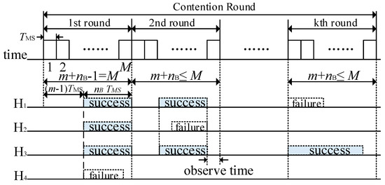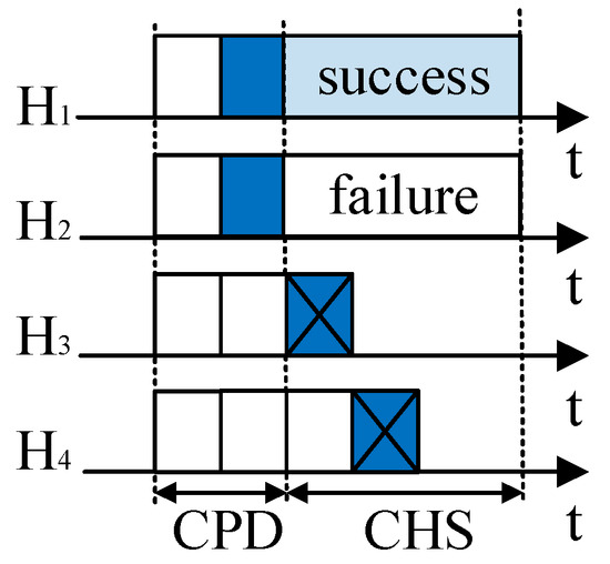 There are k rounds of contention with at most M contention minislots in each round in k-CR, as shown in Figure 6. The potential helpers that win in the CPD randomly select the m-th (1 ≤ m ≤ M) minislot to start sending a busy tone with a length of nB (1 ≤ nB ≤ M, and m + nB − 1 ≤ M) minislots. Each potential helper senses the channel before sending its own busy tone. If there is a busy tone in the channel before its busy tone transmission, it will withdraw from the contention (e.g., H2 in the second round in Figure 6). Otherwise, it will send its predefined busy tone. Once a potential helper finishes its own busy tone transmission, it will observe the channel for one minislot if there are remaining minislots in the current round (i.e., m + nB ≤ M). If it senses other busy tones, it will abandon the remaining contentions (e.g., H4 in the first round). Otherwise, it will participate in the next round of contention (e.g., H1 and H3 in the second round in Figure 6). However, if there is no minislot left (i.e., m + nB − 1 = M), the potential helpers with the earliest busy tone transmission will continue to the next round directly (i.e., H1, H2, and H3 in the first round in Figure 6). Therefore, the potential helpers with the earliest busy tone transmissions and the longest busy tone duration win in each round and continue to the next round of contention until the end of k-CR process.