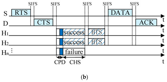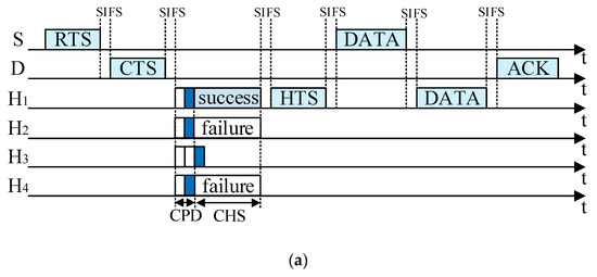 (2) If there are at least two helpers winning in the CHS process, they send their HTS packets simultaneously, which causes packet collisions at S and D. Thus, S sends its data packet to D directly. As shown in Figure 7b, both H1 and H2 win in the CHS process and they send their HTS packets at the same time. Therefore, S sends its data packet to D directly. After D receives and decodes the data packet successfully, it replies to S with an ACK packet.