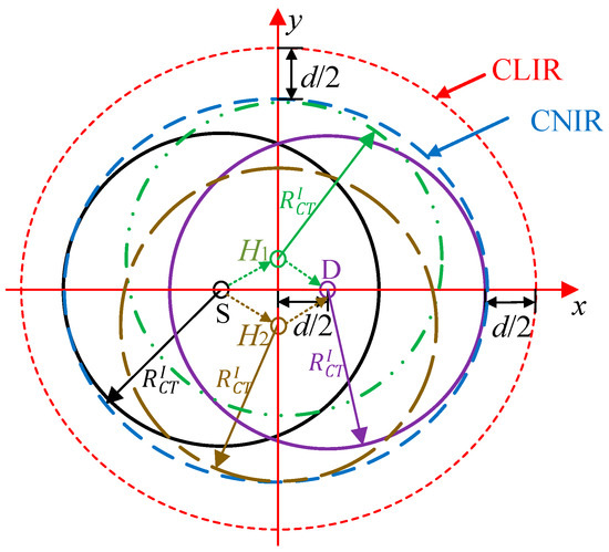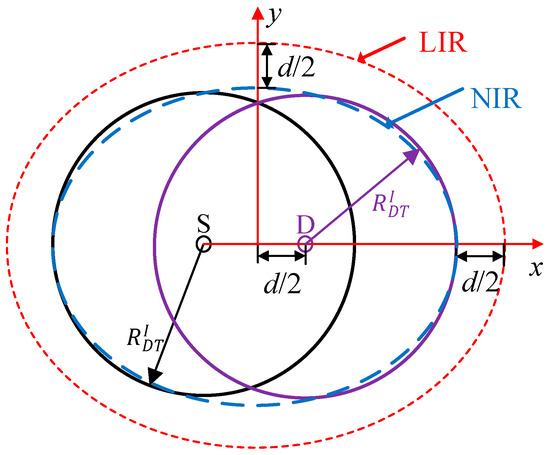 As shown in Figure 9, we approximate the IR of cooperative transmission links as an elliptical region using the same method as direct transmission links. Therefore, the semi-major axis and semi-minor axis can be written as
