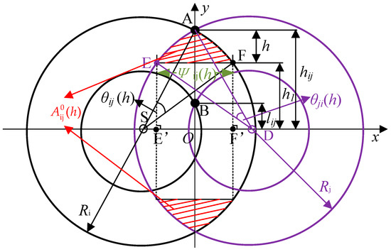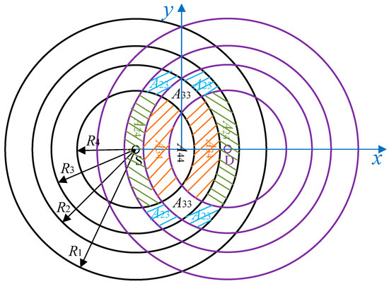 where is the size of the area formed by y ≥ hij − h, and two circles with the centers at S and D, and the radiuses Ri and Rj, respectively, as the red shadow area shown in Figure 10. Equations (11)–(15) mean that is the size of the region with Y coordinate y larger than the helpers’ largest Y coordinate hij-h in the area Aij for the same cooperative priority with the transmission rate (ri, rj) or (rj, ri), which is also equal to that of the intersection area of these two cooperative transmission circles above the X-axis , subtracting the size of the overlapping area with all higher cooperative priorities when the overlapping area exists. Note that for different pair (i, j), the numbers of subareas of Aij are different, as shown in Figure 11. The size of the red shadow area in Figure 10 is composed of three parts, i.e., the double area of the triangle AEF (where E and F are the intersection points of the line y = hij − h and the two circles with radiuses Ri and Rj), the double areas of the differences between two triangles ASF and ADE, and their associated fans. Therefore, it can be expressed as