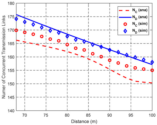 Figure 12 shows the impact of distance d between S and D on the number of concurrent transmission links in DT and CT of ORS-CMAC. Both the number of concurrent transmission links in DT, i.e., ND, and the number of concurrent transmission links in CT, i.e., NC, decrease with the increase of d. This is because an increase of d causes the enlarged IR as Equations (8), (9), (20), and (21) show, which increases the interference probability, and thus decreases the expected number of concurrent transmission links. It is obvious that the number of concurrent transmission links in CT is less than that in DT, i.e., NC ≤ ND, due to the enlarged IR introduced by the helper. For example, when d = 70 m, the IRs of the direct transmission link and cooperative transmission link are 7.2099 × 104 m2 and 8.2802 × 104 m2, respectively. In most cases, the numbers of concurrent transmission links (i.e., NC and ND) in the theoretical results are smaller than those in the simulation results with the same d. This is because we ignore the concurrent links that exist inside the LIR of other links and outside the NIR of other links for DT, as shown in Figure 8, and those inside the CLIR and outside the CNIR for CT, as shown in Figure 9. As shown in Figure 12, these differences increase with the augmentation of d because the area sizes inside LIR and CLIR and outside NIR and CNIR also increase with the augmentation of d.