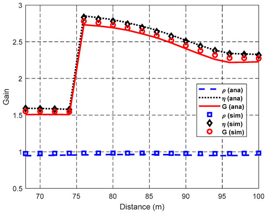 Figure 18 shows that the SFRG ρ decreases slightly with the increase of λH because the expected value of the largest Y-coordinate of the helper increases as λH increases, which increases the IR of the cooperative transmission link. The SDG η increases with the increase of λH and then decreases slightly when d = 70 m. This is because the probability that uses a higher equivalent cooperative transmission rate increases as λH increases. However, the probability of selecting only one helper decreases when the number of the helpers in a specific area becomes larger. Based on these, cooperation gain G retains a similar trend with the SDG η. The slope of the SDG η with the small helper density λH is larger than that with the large helper density, because at small helper densities, both the probability of using the cooperative transmission and the probability of using the cooperative transmission with higher equivalent cooperative transmission rate increases greatly with the growth of the number of helpers existing in the associated area Aij. When λH becomes large enough, the probability of employing the cooperative transmission with a higher equivalent cooperative transmission rate reaches close to the maximum value, and this results in the very small increments of SDG η.