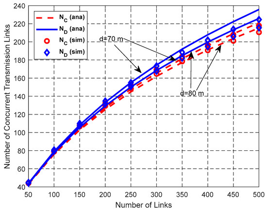 As shown in Figure 15, both ND and NC increase with the increase of the total number of links NL and ND > NC. According to the random scheduling scheme, P(k, n) decreases with the increase of n for the same k. Therefore, the interference-free probability between the newly-added link and the already-existing links that can be scheduled concurrently decreases, which leads to the decrease of the increasing rate of the number of concurrent transmission links.