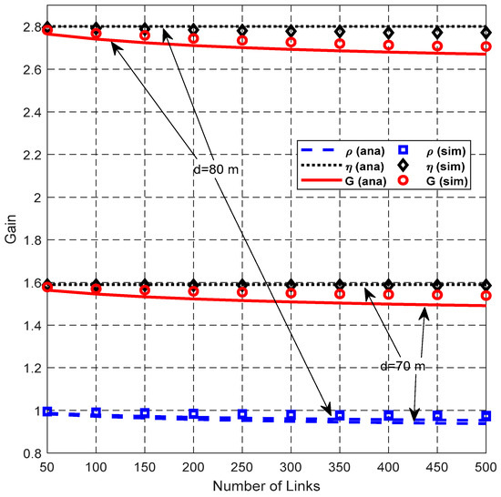 Figure 12, Figure 13 and Figure 14 show the impact of the distance d between S and D on the network performance, i.e., the numbers of concurrent transmission links in DT and CT (i.e., ND and NC), the spatial frequency reuse gain ρ, spatial diversity gain η, cooperation gain G, and network throughput, when NL = 300 and λH = 0.003 nodes/m2. It can be seen from the figures that the simulation results coincide with the theoretical results. The gaps between simulation results and theoretical results are due to the conservative estimate of the elliptical region model, which may block possible concurrent transmission links.
