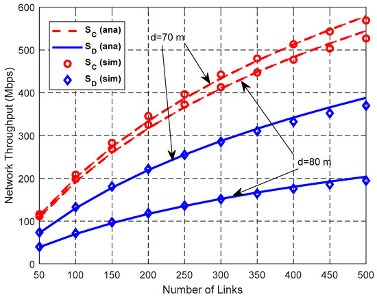 As shown in Figure 14, the network throughput decreases with the increase of d because the IRs of the links increase and the number of concurrent transmission links decreases as d increases. Furthermore, the probability of using the highest cooperative transmission rate decreases, because the area of A44 decreases as d increases. When d ≤ R3 = 67.1 m, SD and SC are the same because all links adopt DT mode to transmit data packets. However, when d > R3, in spite of NC ≤ ND, the network throughput in CT is larger than that in DT. This is because the SDG η achieved by cooperative transmissions can compensate for the reduction of SFRG ρ, thus improving the network throughput. When d is around 75 m, the rapid decrease of SD is also caused by the rSD‘s transformation from r2 to r1.