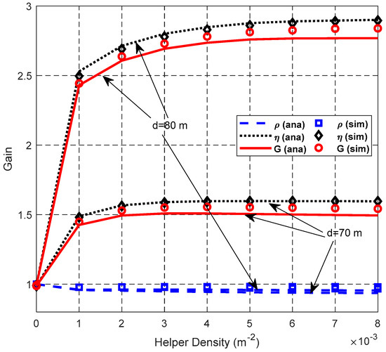 Figure 18 and Figure 19 show the impact of helper density λH on the network performance with NL = 300, and d = 70 or 80 m.