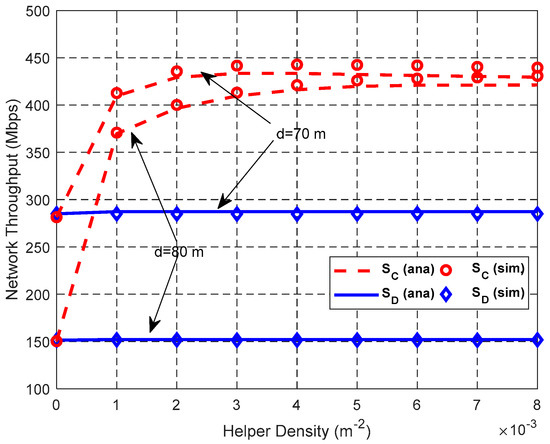 Figure 19 shows that with the increase of λH, the network throughput of DT SD is stable, and the network throughput of CT SC increases and then decreases slightly. As expected, the probability that employs a higher equivalent cooperative transmission rate increases as λH increases, thus increasing the network throughput in CT mode. However, if λH > 0.004 nodes/m2 and d = 70 m, the network throughput of CT decreases slightly as λH increases. This is because the number of helpers in the same Aij increases with the increase of λH, and thus decreases the success probability of selecting the optimal helper and increases the transmission time of a data packet.