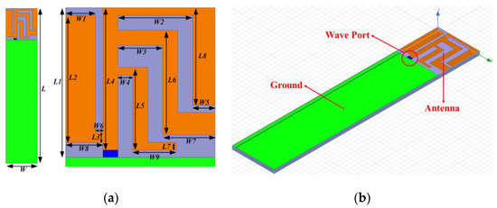 The structure of the planar USB dongle antenna proposed in this study is illustrated in Figure 2a. The size of the main structure is 10 × 10 mm2, while the volume of the planar USB dongle antenna assembly is 10 × 50 × 0.8 mm3. The detailed dimensions of the planar USB dongle antenna are listed in Table 1.