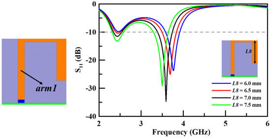 The proposed multiband planar USB dongle antenna is constructed using two main antennas (arm1 and arm2) and two stubs (stub1 and stub2). The design and optimization of the proposed antenna involves four steps (Step 1–4). The first step (Step 1) uses an arm to resonate the modes in the lower and middle bands. This arm is called arm1 and is shown in Figure 3a. The main antenna is specifically labelled arm1 with a length of 21 mm. Its lower band resonates, which satisfies the resonated condition of a quarter wavelength. Figure 3b shows the surface current distribution on arm1 at 2.45 GHz. On the other hand, Figure 3c illustrates the middle band, which satisfies the resonated condition of a half wavelength. This is the second resonant mode of arm1. Figure 4 shows the simulation results of the return loss with various L8 parameter values for arm1. In Step 1, the parameter L8 decides the total length of arm1 and optimizes the frequency range of the lower and middle bands. The operation frequency range is closest to the design goal when L8 is 6.5 mm. The impedance match is poor in the lower band, which leads to a small operation bandwidth. The succeeding steps of the design can improve on this by adding a stub.