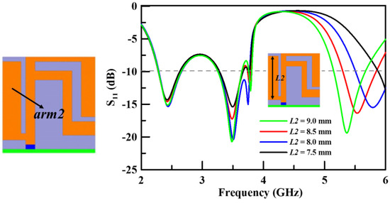 At the third step (Step 3), another main arm (arm2) is added in the circuit in order to resonate the upper band. Figure 6 shows the structure of arm2 and illustrates that arm2 resonates the upper band. This design satisfies the resonated condition of a quarter wavelength. The parameter L2 is an important variable factor of arm2 to decide the frequency range of the upper band. Figure 6 illustrates the simulation results of the return loss with various L2 parameter values for arm2. The operation frequency range is closest to the design goal when L2 is 8.5 mm.
