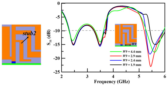 The fourth and last step (Step 4) incorporates an inductive stub (stub2) that can neutralize the capacitive circuit to enhance the bandwidth of the upper band. The main function of stub2 is to tune the upper band impedance for the proposed antenna. However, this also slightly affects the characteristic of the middle band. The bandwidth of the upper band is at its widest when W9 is at 2.9 mm. Figure 7 shows the simulation results of the return loss with various W9 parameter values for stub2. The last optimized result is shown as the red curve in Figure 7.