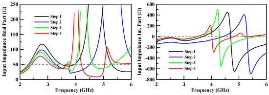 The 10 dB bandwidth of the lower band ranges from 2.30 to 2.70 GHz, the middle band ranges from 3.25 to 3.72 GHz, and the upper band ranges from 5.15 to 5.95 GHz. These simulated results fulfill the spectrum requirements of LTE bands and cover the 5G system (Sub 6 GHz spectrum). Otherwise, these operation bands can cover the LTE-U band in the 5G system. The variation of impedance for each step in the design process is shown in Figure 8. The imaginary part of the impedance is close to zero ohm during the optimized processes.