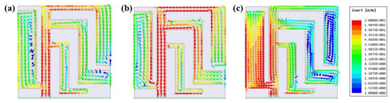 The surface current distribution of the planar USB dongle antenna is shown in Figure 9. Specifically, Figure 9a,b illustrates the current distribution at 2.45 GHz lower band and 3.51 GHz middle band, respectively. These results are not easy to differentiate, using the characteristics of the lower band and the middle band. The surface current distributions are similar to the results shown in Figure 3 for arm1. However, there are conspicuous coupling effect on both stubs, stub1 and stub2. These two stubs possess not only the function of impedance tuning but also the coupling effect. On the other hand, Figure 9c illustrates the current concentration on the main antenna arm2 at 5.45 GHz upper band. This result shows that the upper band is resonated by arm2. Moreover, Figure 9c shows that the design satisfies the resonated condition of a quarter wavelength.