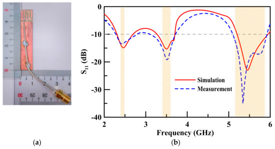 Figure 10a shows the planar USB dongle antenna assembly that is fabricated on an FR4 substrate. The proposed antenna was simulated using the EM simulator ANSYS HFSS. Figure 10b shows both the measured S11 of the proposed antenna as well as the simulated results. The measured 10 dB bandwidth of the lower band range is 2.27–2.79 GHz, the middle band range is 3.10–3.72 GHz, and the upper band range is 5.10–5.92 GHz. The measured results were based on a 10 dB return loss threshold that could cover an LTE inclusive of the 2.30–2.69 GHz, 3.40–3.70 GHz, and 5.15–5.85 GHz bands, as well as the entire frequency bands of the 5G system (frequencies lower than 6 GHz). The LTE-U band for the 5G system is included in WLAN, which the proposed antenna can support as well. As for the simulated results, it clearly shows the same trend as that of the theoretical measured results. The three operating bands work at 2.53 GHz, 3.41 GHz, and 5.51 GHz, with a bandwidth of 20.6%, 18.2%, and 14.9%, respectively.