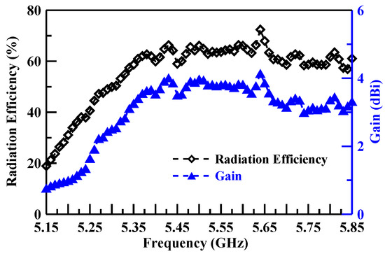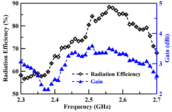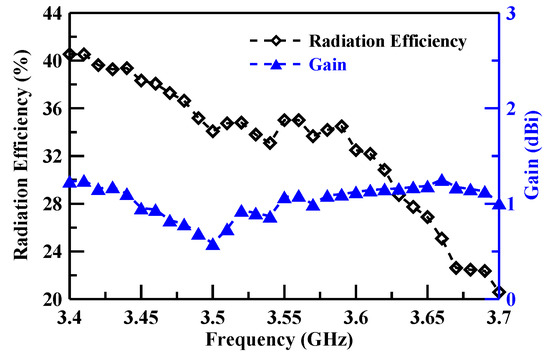 Figure 11, Figure 12 and Figure 13 illustrate the peak gain and radiation efficiency. Figure 11 shows a peak gain of 2.16–3.51 dBi with a radiation efficiency of 56.65–88.37% for the lower band. The middle band shows a peak gain of 0.60–1.24 dBi with a radiation efficiency of 20.59–40.54%, as illustrated in Figure 12. The upper band peak gain of 0.84–4.13 dBi with a radiation efficiency of 18.91–72.42% is shown in Figure 13.