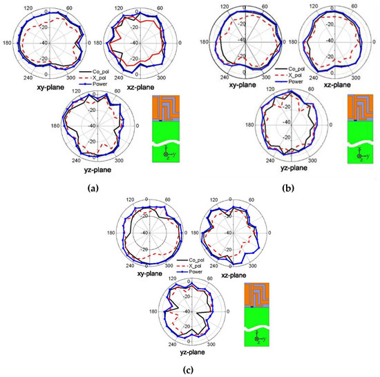 Two-dimensional normalized radiation pattern of the planar USB dongle antenna at (a) 2.45 GHz, (b) 3.51 GHz, and (c) 5.45 GHz.