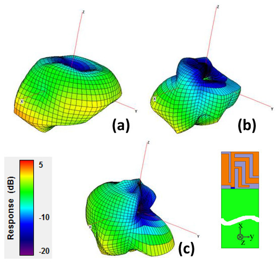Three-dimensional normalized radiation pattern of the planar USB dongle antenna at (a) 2.45 GHz, (b) 3.51 GHz, and (c) 5.44 GHz.