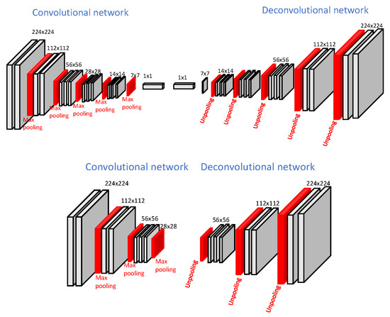 The DeconvNet [16] is learned on top of the VGG-16 network [2] and takes 2D images 224 × 224 pixels in size. The deconvolutional part is a mirrored version of the convolutional part and contains 13 layers on both the convolutional and deconvolutional side. The convolutional part is converged into two fully connected layers augmented at the end to impose class-specific projections. It is trained using a two-stage training procedure in which the first step involves training with easy examples. The second stage involves fine-tuning of the network learned in first stage with more challenging images. Our light-weight network consists of seven convolutional layers and three pooling layers towards the convolutional side. The deconvolutional network is the mirrored version of the convolutional network. The major modification in architecture [16] is the removal of some intermediate layers, including fully connected layers, which improves the computational complexity of the network. Both the architectures, DeconvNet and light-weight, are called encoder–decoder-based architectures, in which the convolutional part downsamples and the deconvolutional part upsamples the feature maps. Such architectures allow the use of max-pooling indices during upsampling which helps to obtain better segmentation maps with preserved global context information. However, the use of max-pooling indices slightly increases the computational cost. The original DeconvNet architecture and proposed light-weight network architectures are shown in Figure 1. The details, including each layer’s output and the kernel size of our light-weight network architecture, are shown in Table 1.