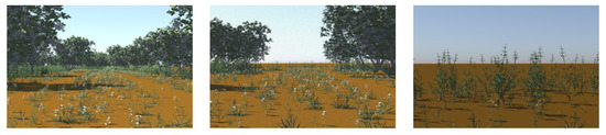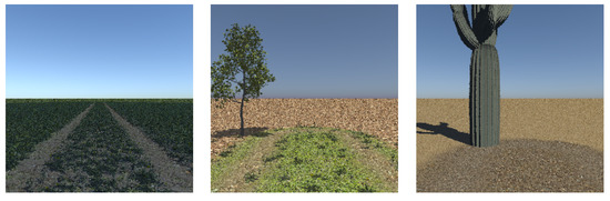 Three sets of synthetic data were used which were generated using a specially designed simulator enabled by the MSU Autonomous Vehicle Simulator (MAVS) [42,43]. This simulator is a physics-based sensor simulator for ground vehicle robotics that includes high-fidelity simulations of LiDAR, cameras, and several other sensors. In this work, these datasets are considered to assess the performance of segmentation, transferring the knowledge from the pre-trained convolutional network to the simulated dataset. In addition, we assess the segmentation performance by transferring the knowledge from the synthetic dataset to a real-world off-road driving scenario. As the off-road vehicle domain has very little data to use for training and it is a domain requiring the highest possible level of accuracy, a larger volume of annotated datasets are required. In order to fulfill this requirement, the use of a synthetic dataset can be a help.
