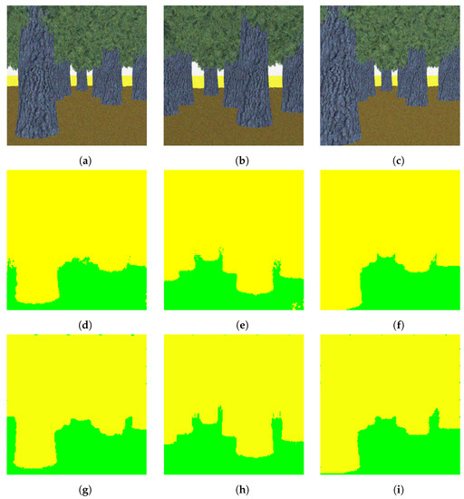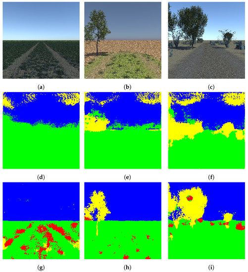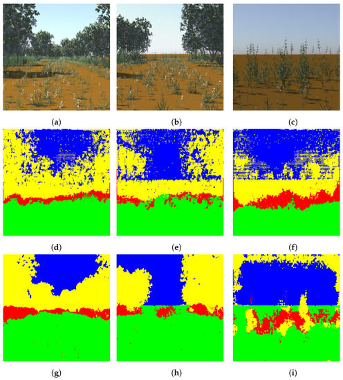 Segmentation of the four-class random dataset (a–c): test images, (d–f): segmented images using DeconvNet, (g–i): segmented images using proposed light-weight network. Note that the color code for classes is: green: ground, red: vegetation, yellow: tree, blue: sky. Best viewed in color.