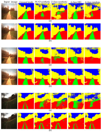 As in the previous experiment, the model trained with the four-class high-definition dataset is fine-tuned using the Freiburg Forest dataset. Only the outermost layer of the light-weight network was learned from scratch with a learning rate of 0.01 and all the other layers with 0.0001. We obtained the improved segmentation performance when compared with the results that did not use the synthetic dataset as well as with that of the two-class synthetic dataset. This improvement is obvious as the four-class high-definition dataset considers more realistic properties of the real-world environment in terms of number of classes and intra-class variability.