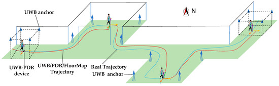Figure 1 is a system concept and novelty of this paper. Firstly, a sparse UWB network is constructed, and UWB anchors are placed at the end of narrow corridors and rooms. The problems of pedestrian motion initialization and positioning error correction are solved. The signals of UWB anchors do not need to cover all areas. Secondly, a pedestrian who wears an UWB-PDR device walks indoor where the floor maps are known. In the process of pedestrian positioning, UWB can be used as an absolute space reference, PDR equipment can be used to encrypt positioning data and blind UWB regional dead reckoning, and the azimuth and spatial coordinates of indoor map can be used to modify the heading angle and position obtained by PDR.