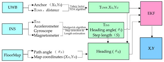 System concept of the proposed pedestrian navigation system based on UWB/PDR/Floor Map.