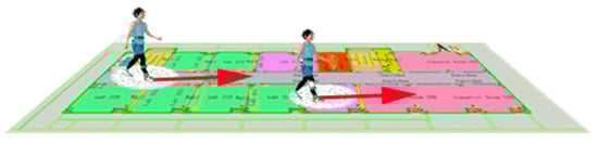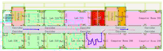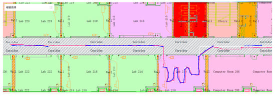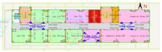 There are two groups of UWB anchors that were placed on the wall of the corridor, and another one-group anchor was placed on the floor surface of the laboratory, as shown in Figure 5b and Figure 6. Figure 6 is the indoor map of the experiment scene.