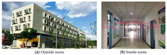 The experiment was carried out in the School of Surveying and Mapping and Urban Spatial Information of Beijing University of Civil and Architectural. A narrow corridor on the second floor and a laboratory are used in this experiment. The length of the corridor is about 65 m, and the width is about 3 m. The area of the laboratory is about 6.2 m × 8.2 m. The outside and inside scenes are shown in Figure 5.
