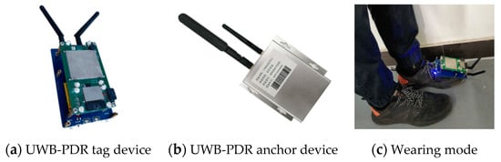 In the research process of this paper, an INS sensor is developed by using an MEMS 9 axis accelerometer, gyroscope and magnetometer of MPU9250 from InvenSense Company (Sunnyvale, CA, USA). The UWB positioning module is developed by using a UM100 chip (Shanghai uPosition information technology Co., Ltd., Shanghai, China). with ranging accuracy of about 10 cm, and the positioning accuracy can reach 15~30 cm. The device and wearing mode are shown in Figure 7.